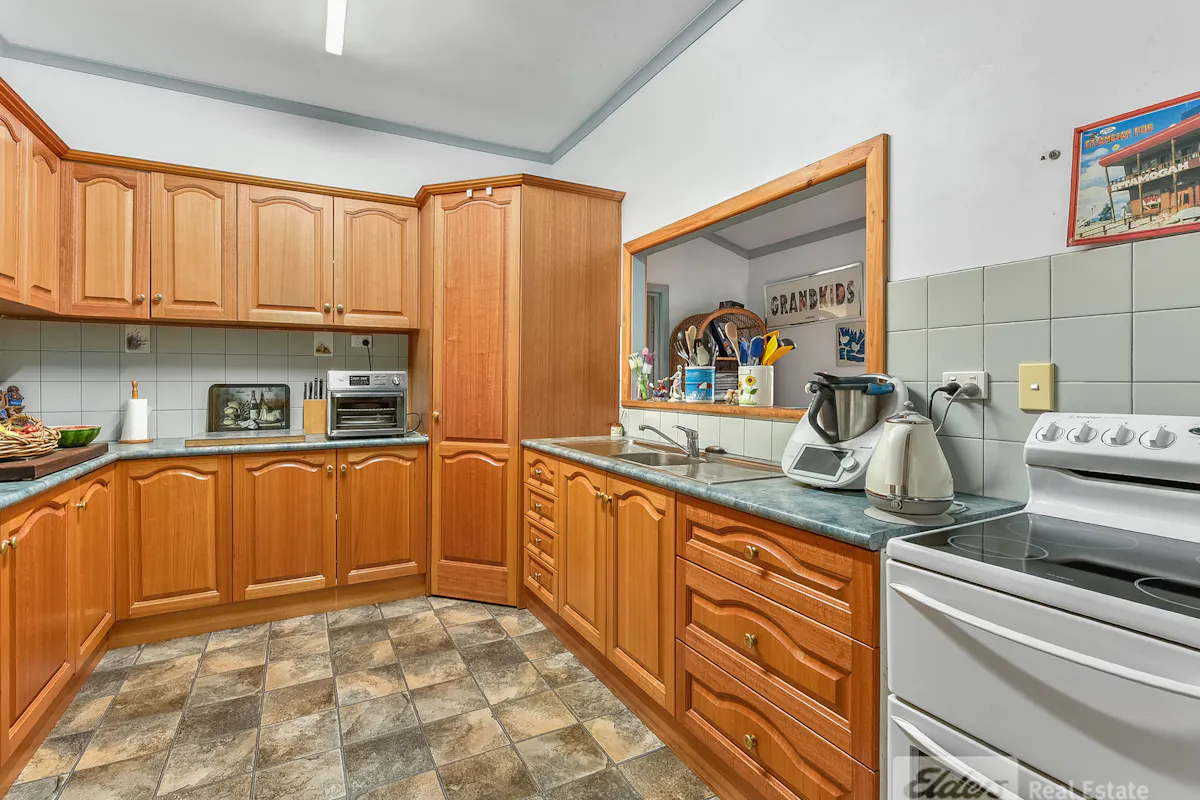 The u-shaped style kitchen offers an excellent selection of quality timber cabinetry, corner pantry and electric stove, while the adjoining lounge room showcases a timber feature ceiling, ceiling fan and slow combustion wood heater for year-round comfort.